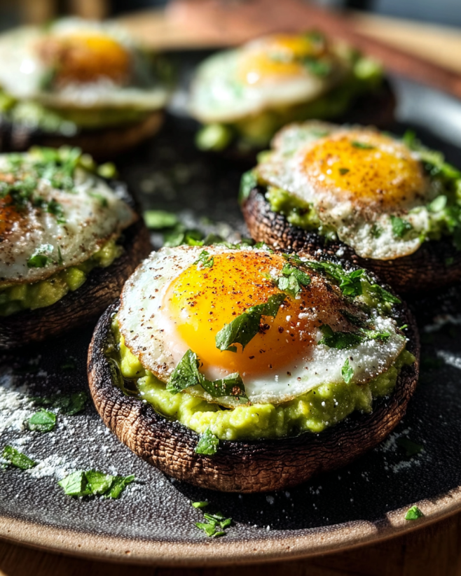 A delicious and healthy meal combining creamy avocado, satisfying eggs, and hearty portobello mushrooms, perfect for breakfast, brunch, or a light dinner.