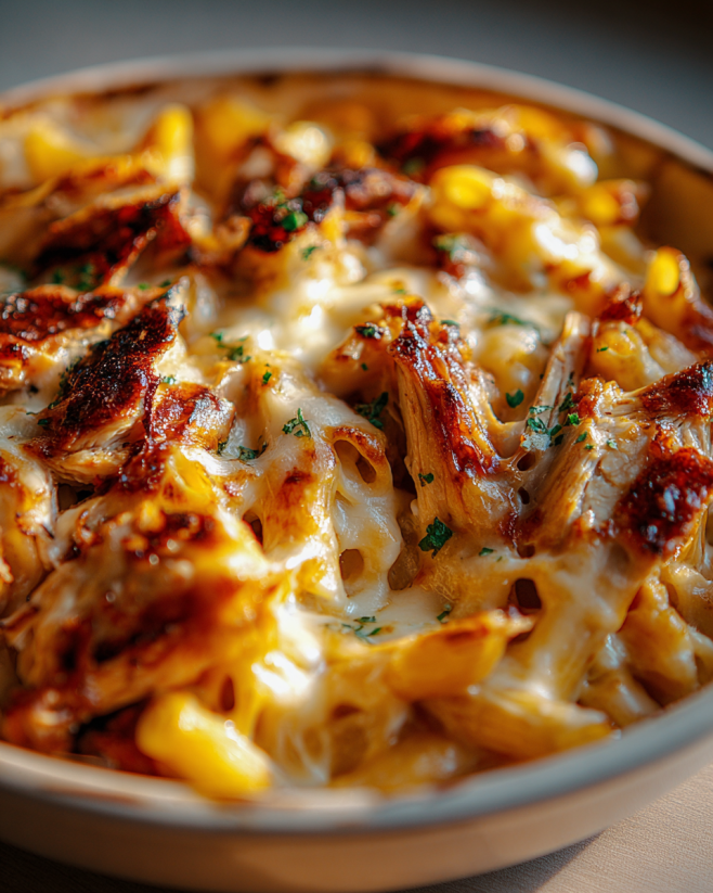 A delightful twist on classic mac and cheese, combining creamy, cheesy goodness with smoky, tangy BBQ chicken flavors.