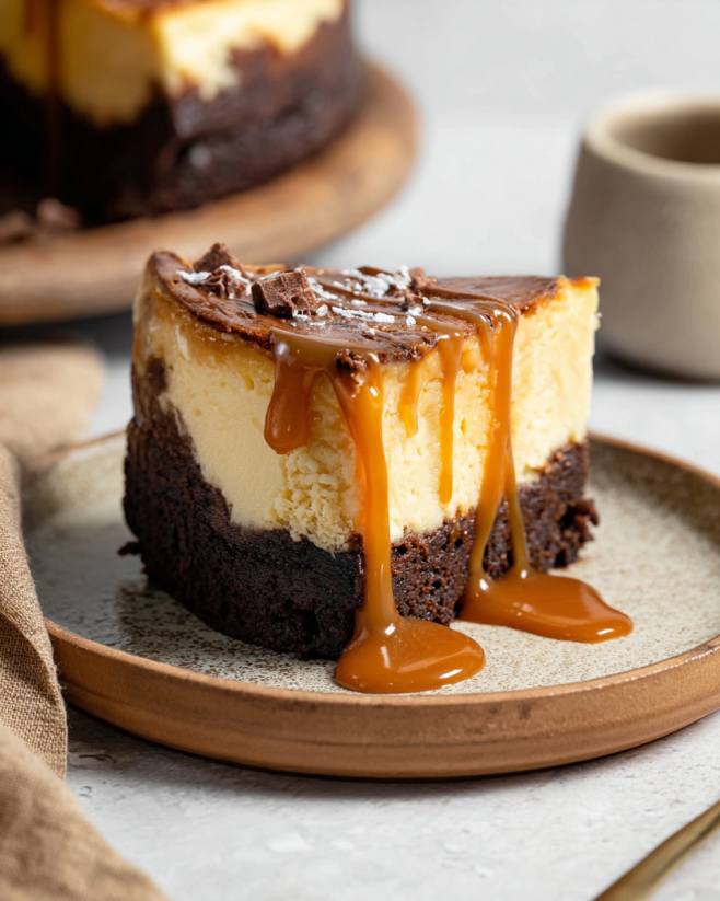 A delightful dessert that combines the rich, fudgy goodness of brownies with the creamy texture of cheesecake, topped with caramel.