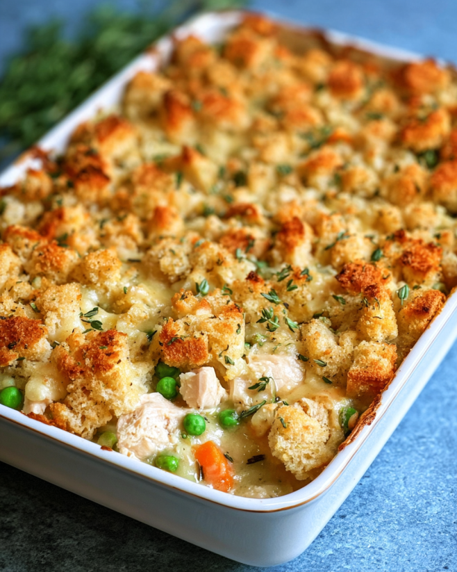 Cheesy Chicken Stuffing Casserole. This dish combines tender chicken, creamy soup, and savory stuffing, all topped with melted cheese. It’s a perfect blend of flavors and textures that will warm your heart and satisfy your taste buds.