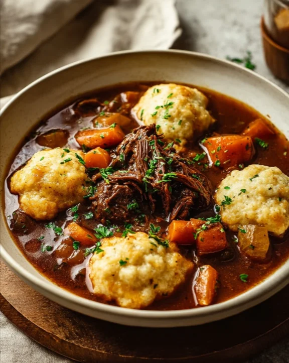 Cozy Slow Cooker Beef Stew with Fluffy Dumplings delights!