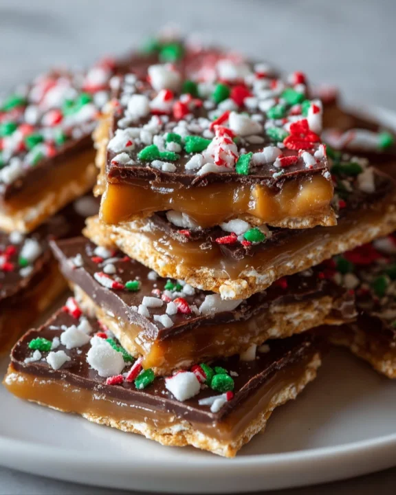 A sweet and crunchy treat combining saltine crackers, caramel, and chocolate, perfect for any occasion.
