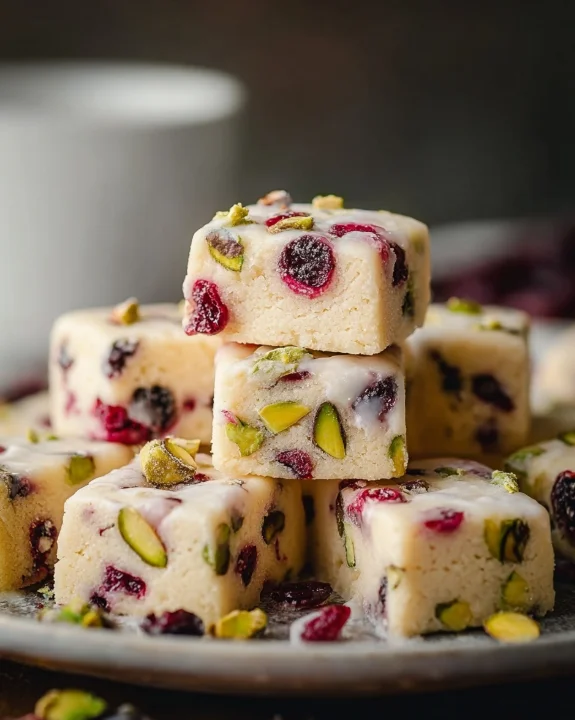 A delightful cookie recipe combining buttery shortbread with the crunch of pistachios and tartness of cranberries.