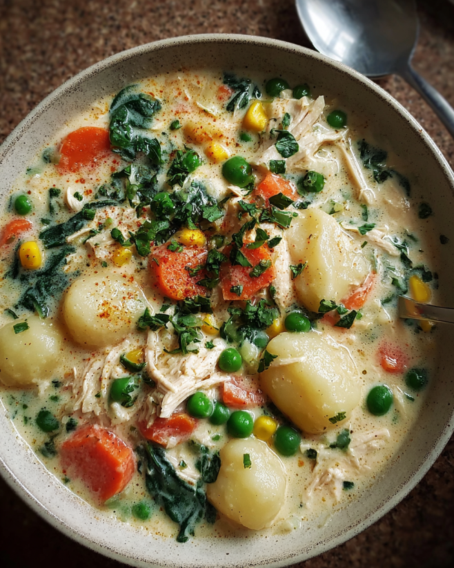 A comforting and delicious soup made with tender chicken, fluffy gnocchi, and fresh vegetables in a rich and creamy broth.