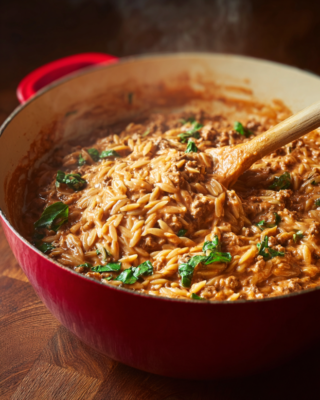 Hearty Beef Orzo with Tomato Cream Sauce. This dish combines the rich flavors of ground beef with the creamy goodness of a tomato sauce, all served over tender orzo pasta. It’s a perfect blend of taste and texture that will warm your heart and satisfy your hunger.