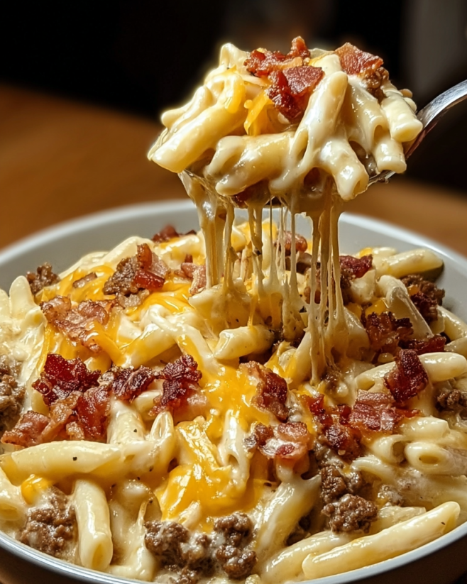 A delightful fusion of creamy Alfredo sauce, savory bacon, and hearty ground beef, perfect for family dinners or gatherings.