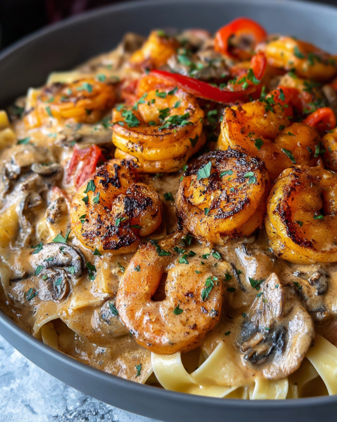 A delightful twist on the classic stroganoff featuring blackened shrimp, creamy sauce, and a hint of Cajun flair.