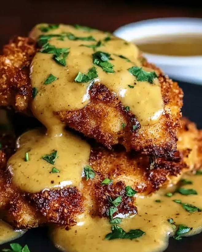 A delightful twist on traditional chicken recipes, featuring a crunchy pretzel coating and a creamy mustard cheddar sauce.