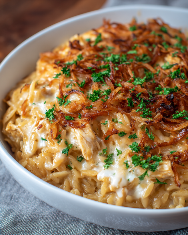 French Onion Chicken Orzo Casserole is a must-try!