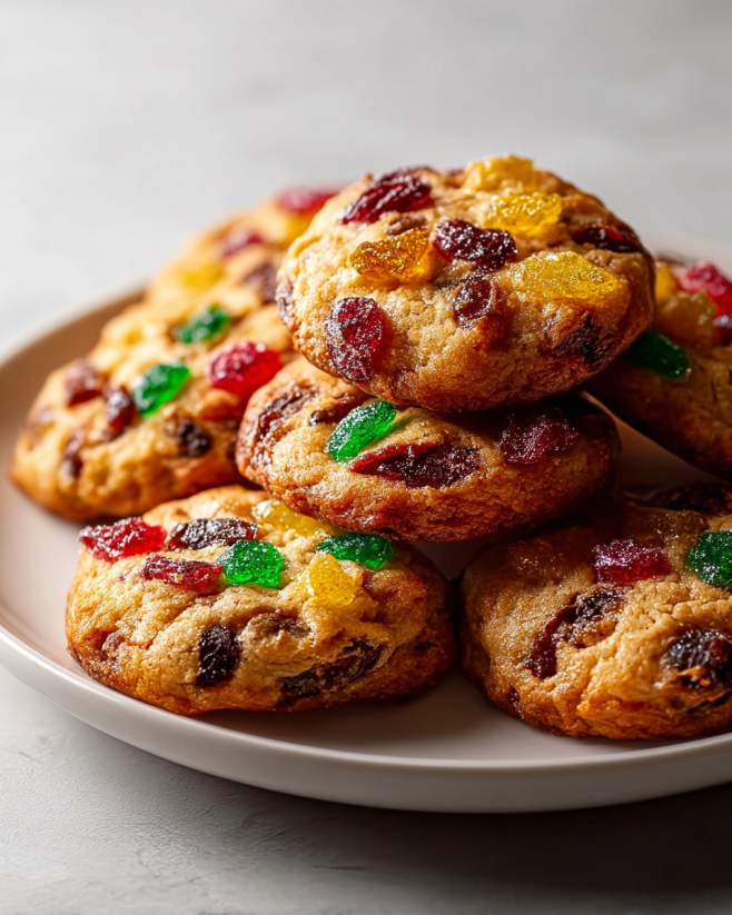 Delightful cookies combining the rich flavors of traditional fruitcake with the fun of cookie baking, perfect for holiday gatherings.