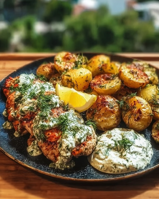 5. Serve the grilled chicken with dill feta cream and crispy baby potatoes.