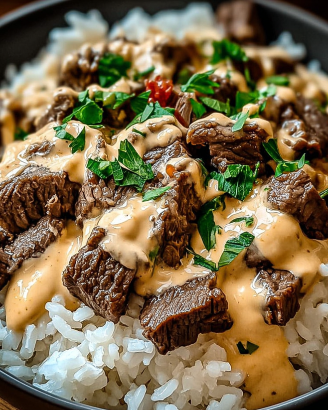 Steak Queso Rice Bowl. Fluff the cooked rice with a fork and divide it among serving bowls. Top each bowl with the steak and vegetable mixture. Don’t forget to add the queso cheese dip generously over the top. For a fresh touch, add diced avocado and garnish with fresh cilantro. Serve with lime wedges on the side for an extra zing!